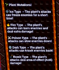 A mutation is a modifier applied to a plant that changes its attack behavior. In practice, mutations usually fall into one of these roles: