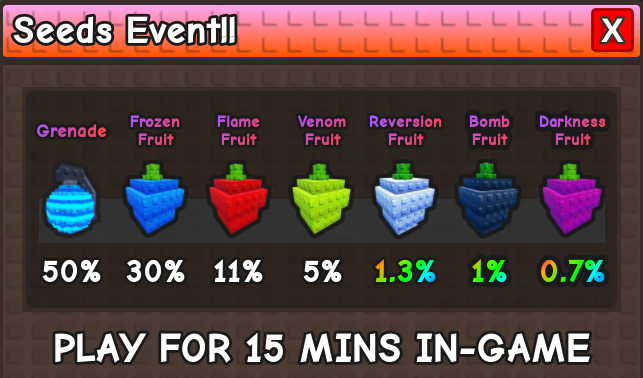 Ví dụ màn hình Seeds Event (tỉ lệ/pool có thể đổi theo update):